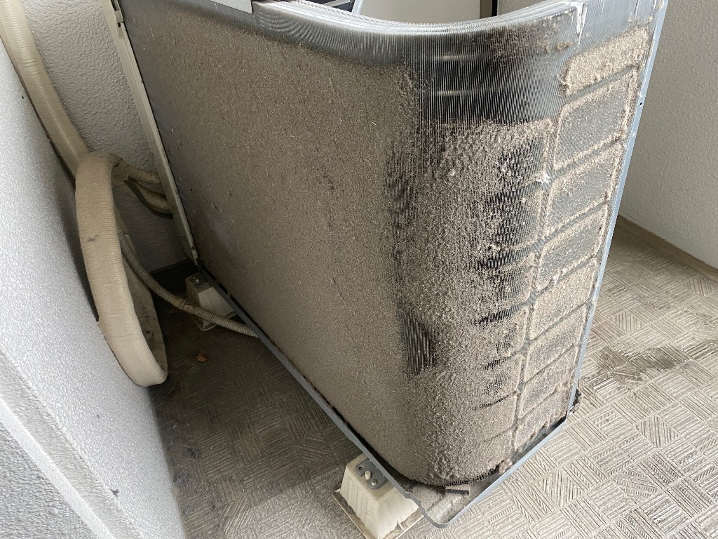 マンションのベランダ設置の室外機。ここまで汚れることはあまりありません。原因は少し上に取り付けられた換気口が原因の様です。早速提案しておそうじさせて頂きました。間違いなく冷房効率アップしてます!