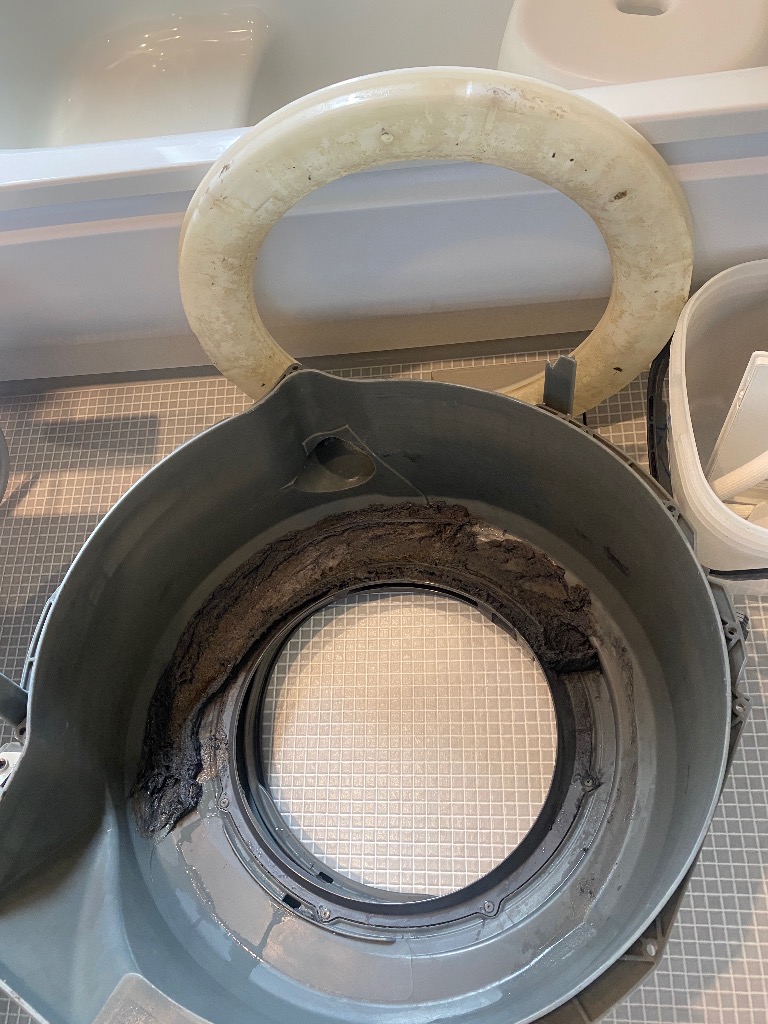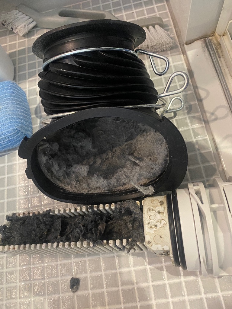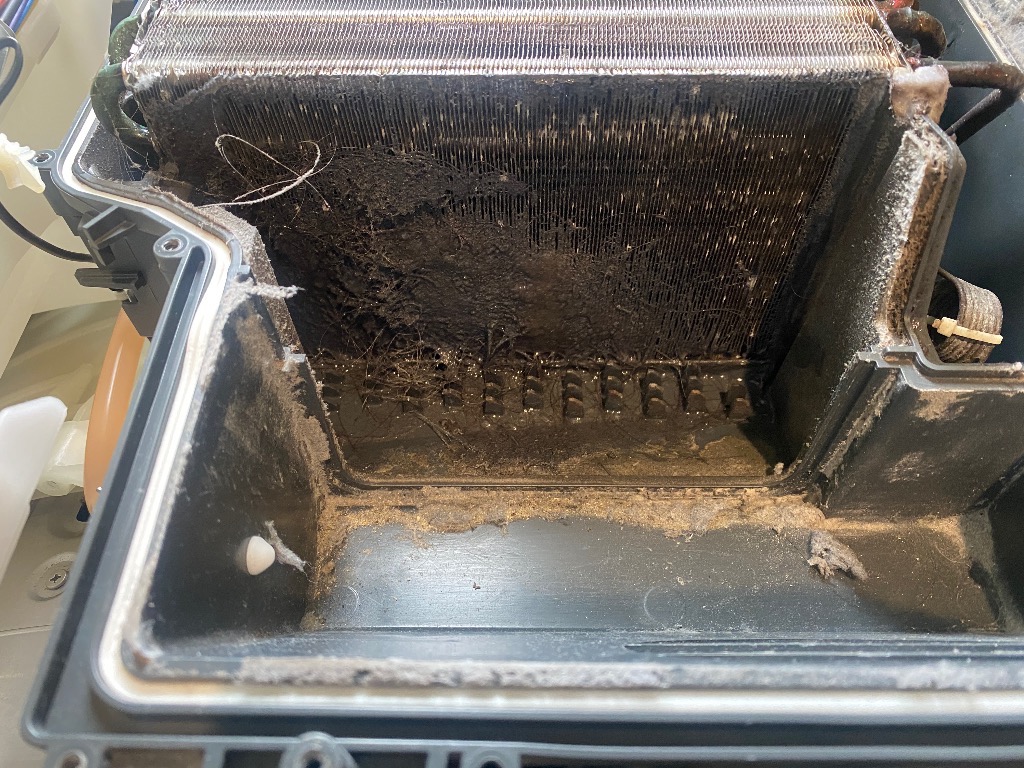乾燥時間が伸びてお掃除の依頼されました。なかなかの汚れ具合。ドラムの外カバーの排水箇所からは割り箸が2本!繊維ゴミの取り出しに苦労されたのがわかる現場でした。