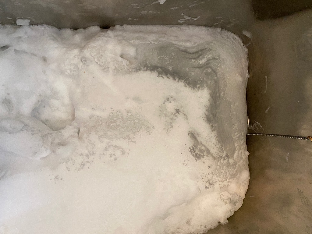 ダークな泡が配管内の汚れ。予期せぬ効果はステンレス浴槽にこびり付いた錆の除去出来た事。施主さん大喜び!