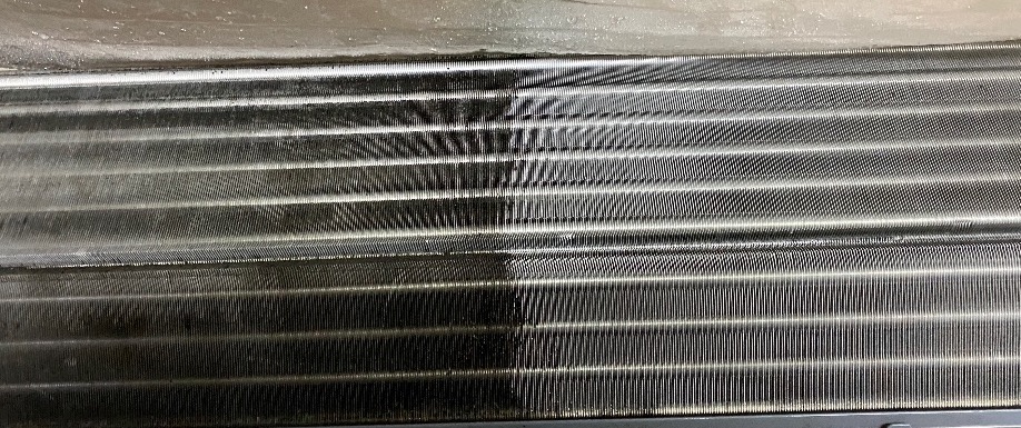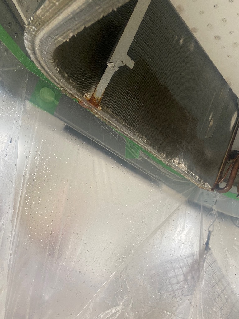 分解して露出した熱交換器。上が洗浄済。色が違うでしょ。禁煙かつ厨房からも離れてるのにこの汚れ。利用時間と人の数に比例して汚れていきます。