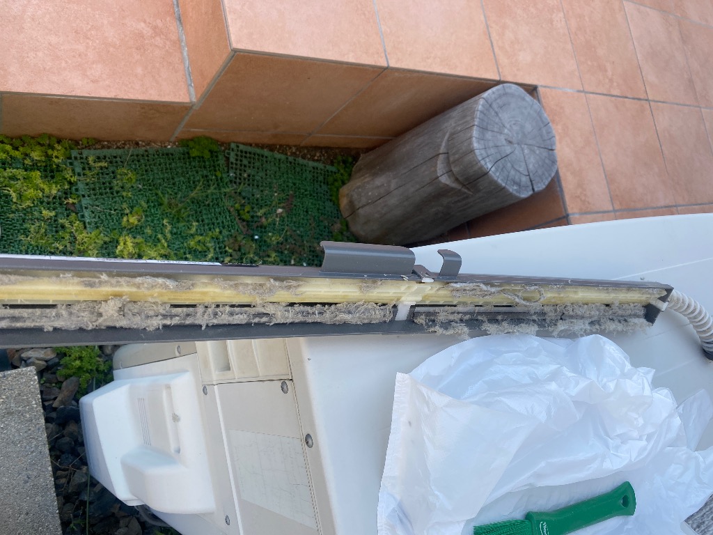 フィルターの埃を自動排出するエアコンのお掃除ノズルを取り外しました。すんごい埃が排出されず溜まったまんま。台所にはこの手のエアコンはお勧めできません。