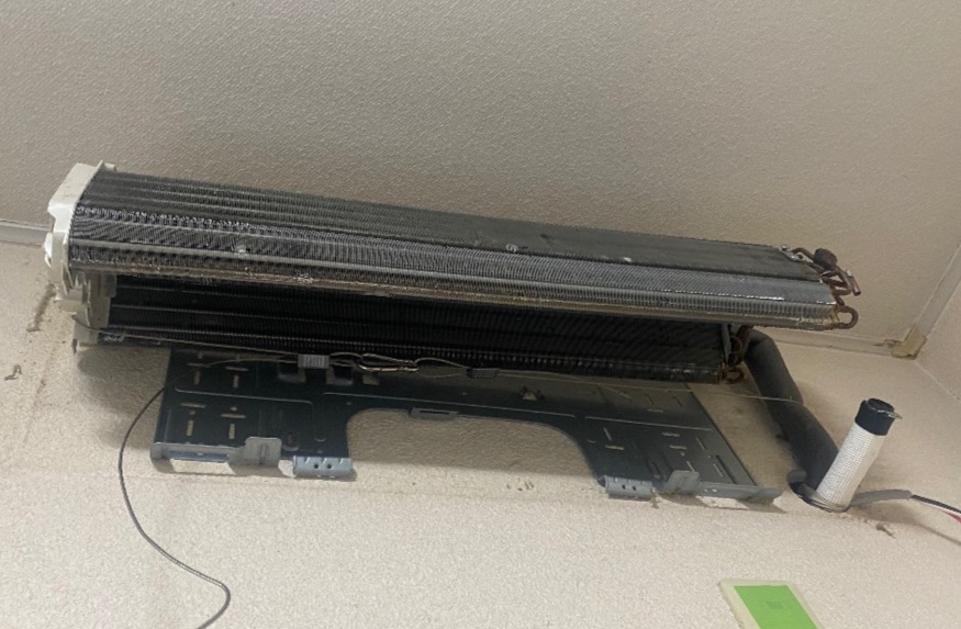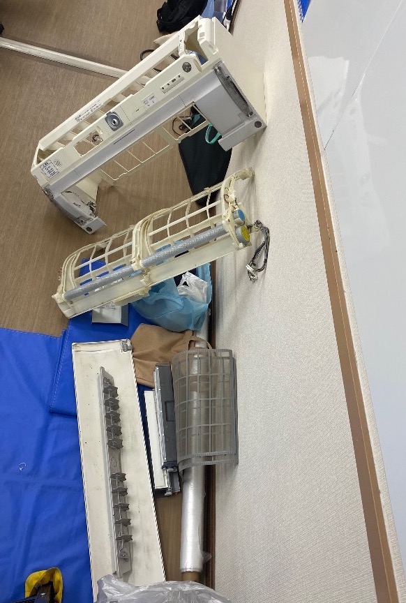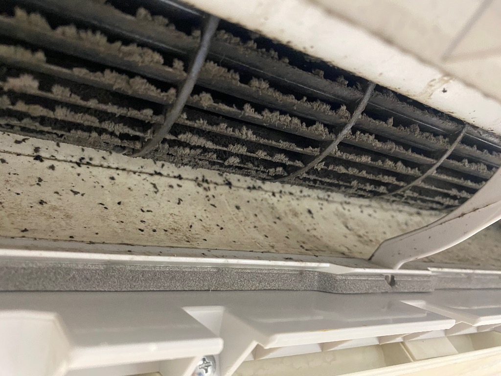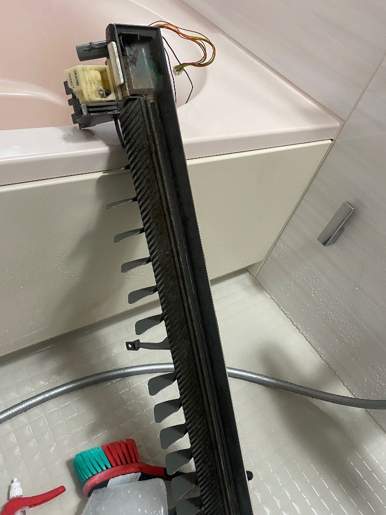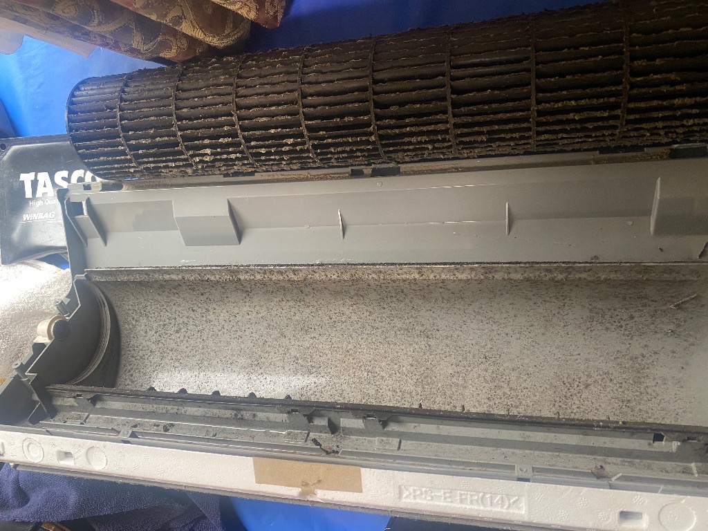 出ました!右側配管。このタイプの完全解体大変なんです。何とか成功し、ほとんどの汚れを取り除きました。キッチンエアコンなので化粧パネルはベト付き、内部はカビが巣食ってます。クリーニング後は風力も改善。喜んで頂けました。