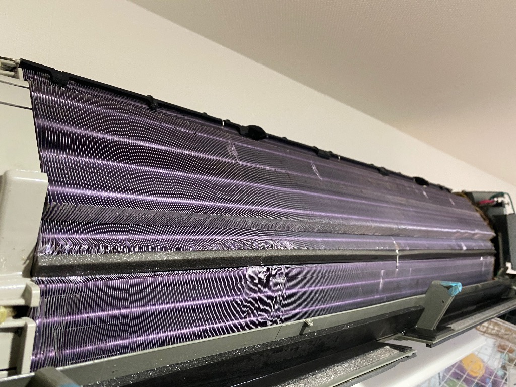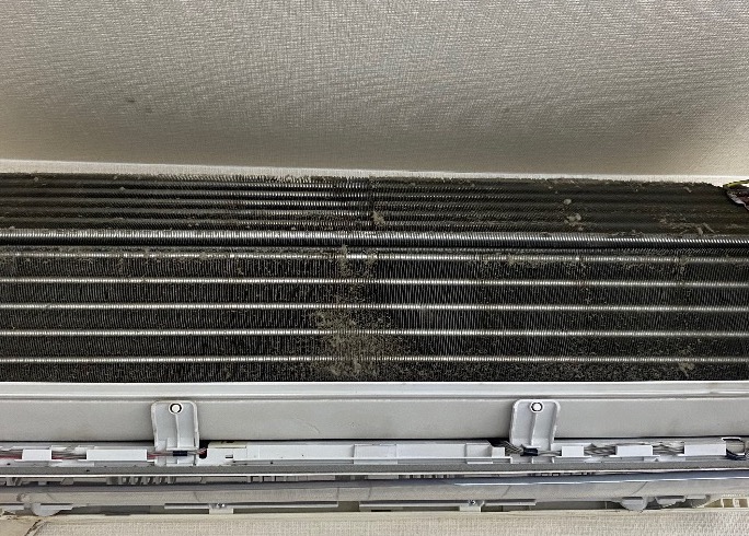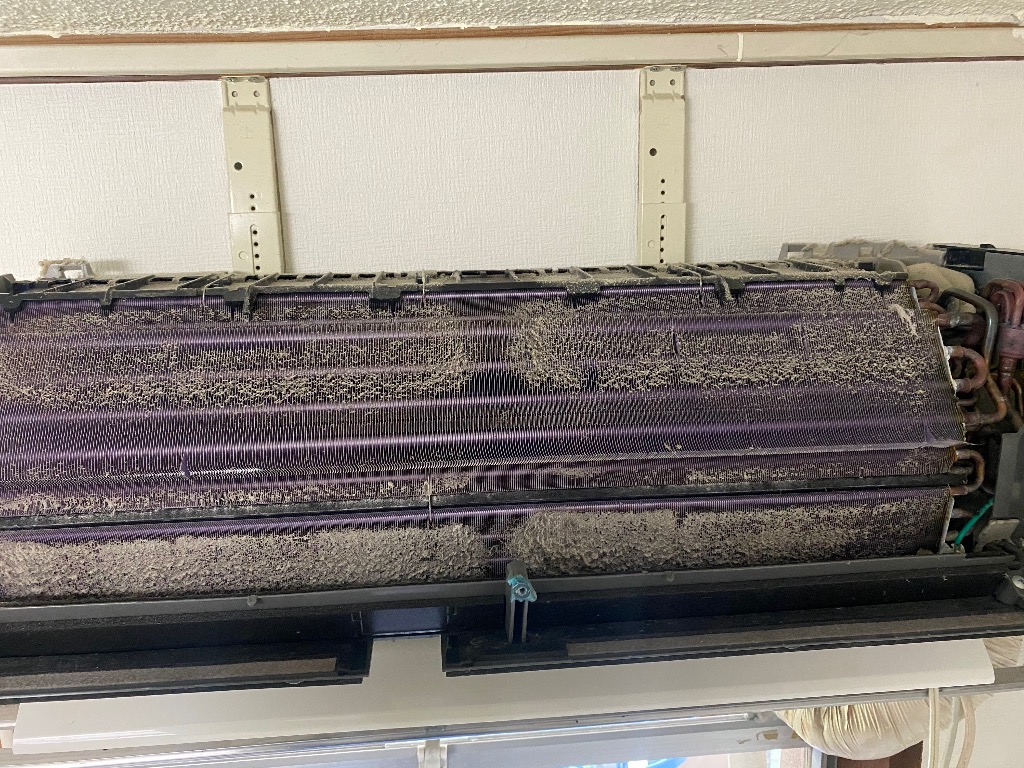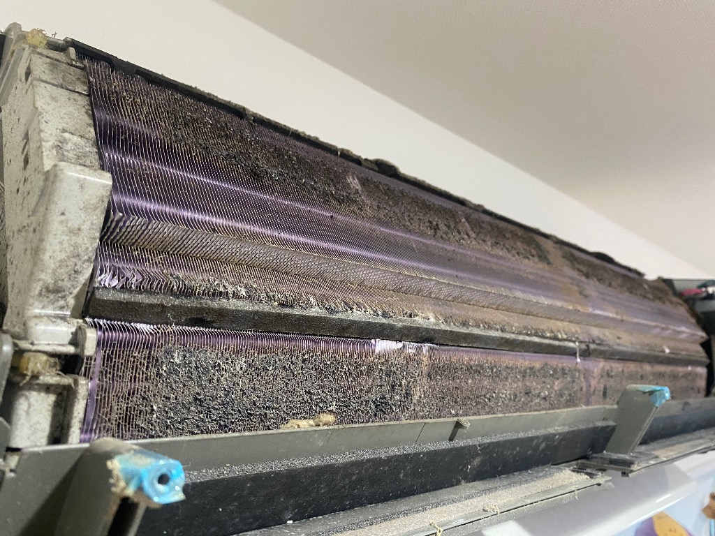 企業さんのエアコン。毎日フル稼働だとファンも熱交換器もこんな状態です。クリーニングで空気の流れが正常に戻り、冷却効率も回復します。見た目もキレイになり喜んで頂けました。