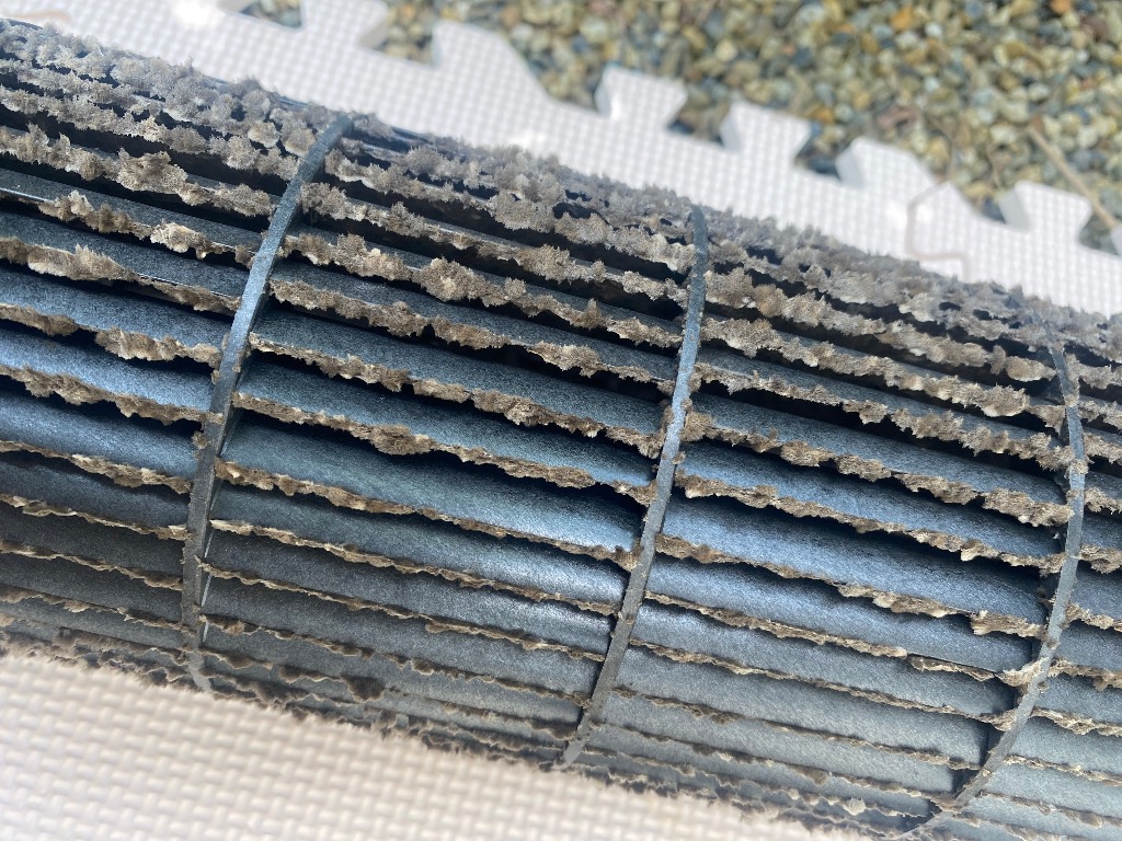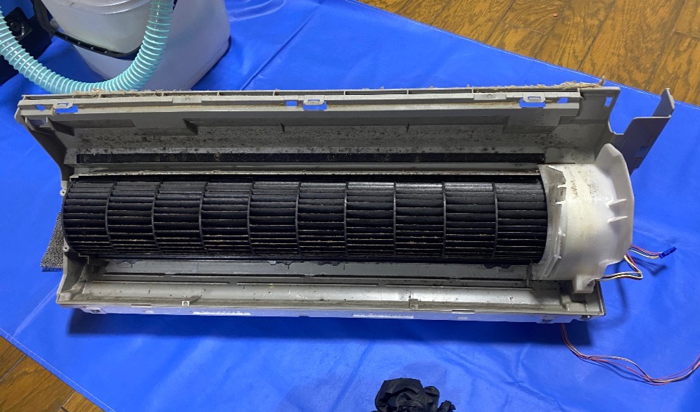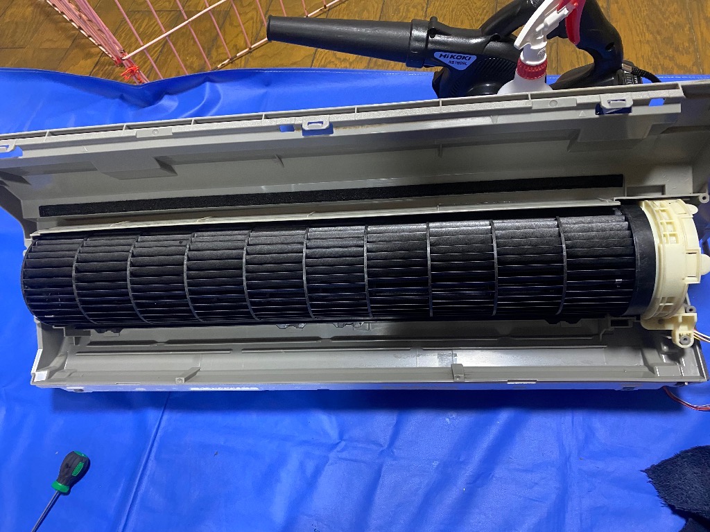 これはシャープのお掃除機能付きエアコンの送風ファン。カビと埃すごいでしょ!こうなると風力も削がれて冷房効率も下がります。カビ菌も撒き散らしてるかも…