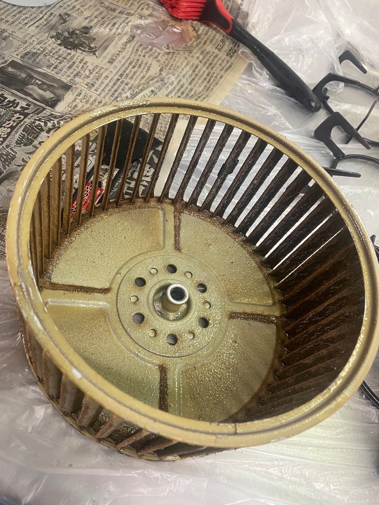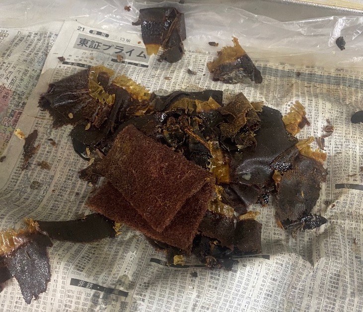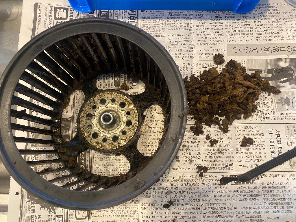 レンジフードのファンハウスから現れた昆布。いえこれは固着した油汚れです。ファンの羽根にも固着した油汚れ。削ぎ落とすのにかなりの腕力と時間を要しました。稼働時の音も軽やかになりました。次回はこうなる前のご依頼お待ちしております!