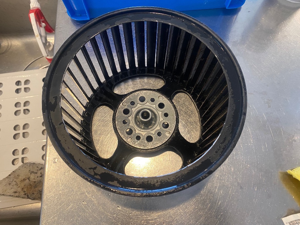 ファンにこびり着いた油汚れ。まずは出来るだけ掻き出します。お湯に浸け置きして残った汚れを柔らかくしてから洗剤洗浄するとこんな仕上がりです。根気要りますよ!